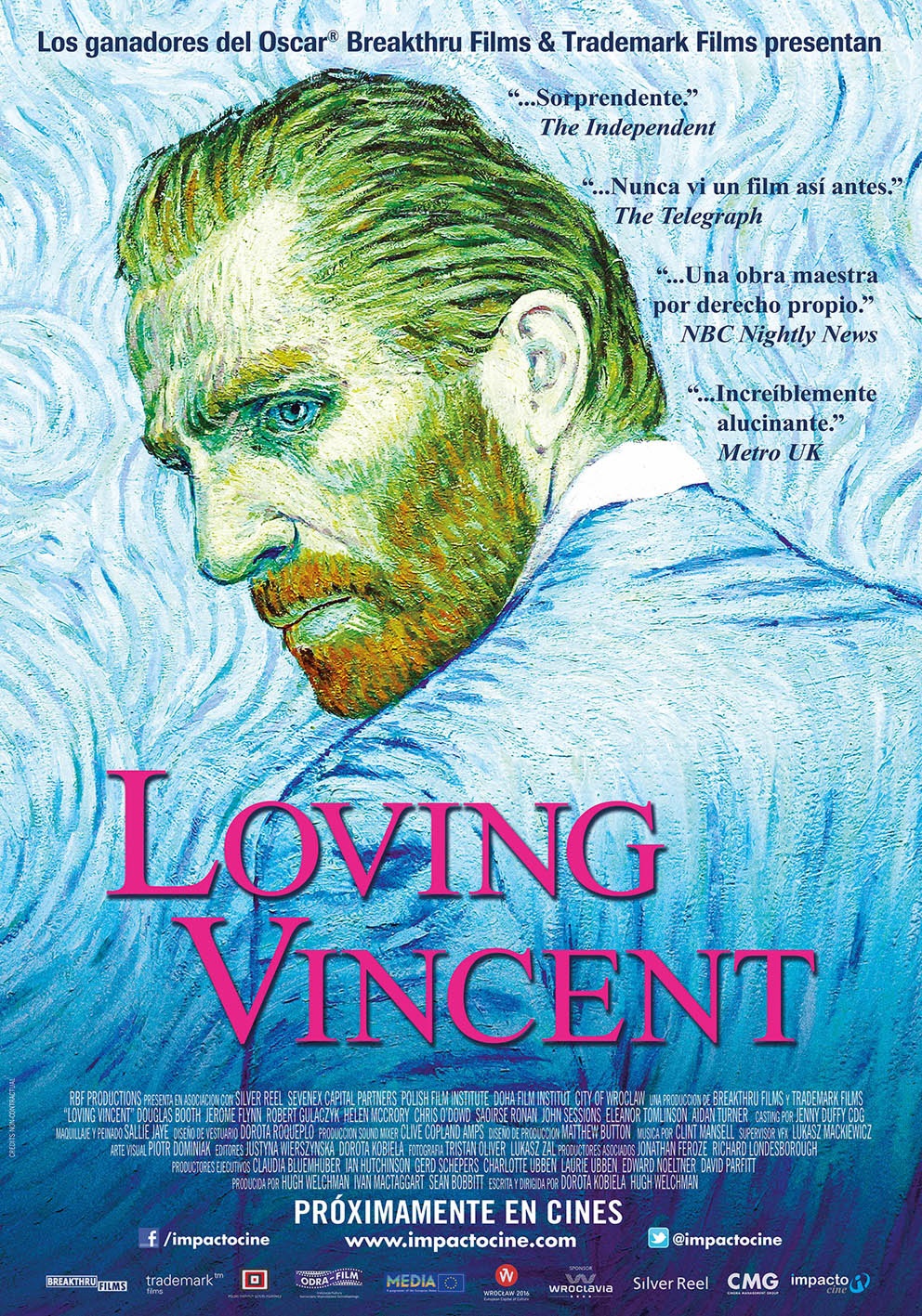 Primer largometraje compuesto por pinturas animadas, Loving Vincent es un film que homenajea el trabajo de uno de los grandes maestros de las artes plásticas, Vincent Van Gogh. Cada fotograma es un cuadro pintado a mano sobre óleo – tal y como el propio Vincent lo hubiera hecho – al que se le ha dado movimiento. Participaron una gran cantidad de excelentes pintores a lo largo de varios años, todos inspirándose en el estilo y arte magistral de Van Gogh. El resultado es una impresionante cinta de animación que repasa la carrera del pintor con delicadeza y originalidad, y que llevó cinco años de trabajo.